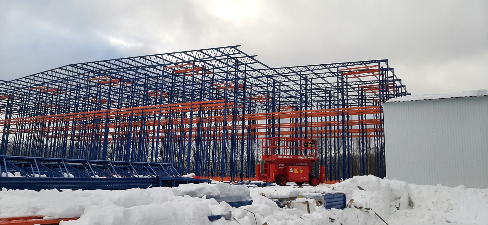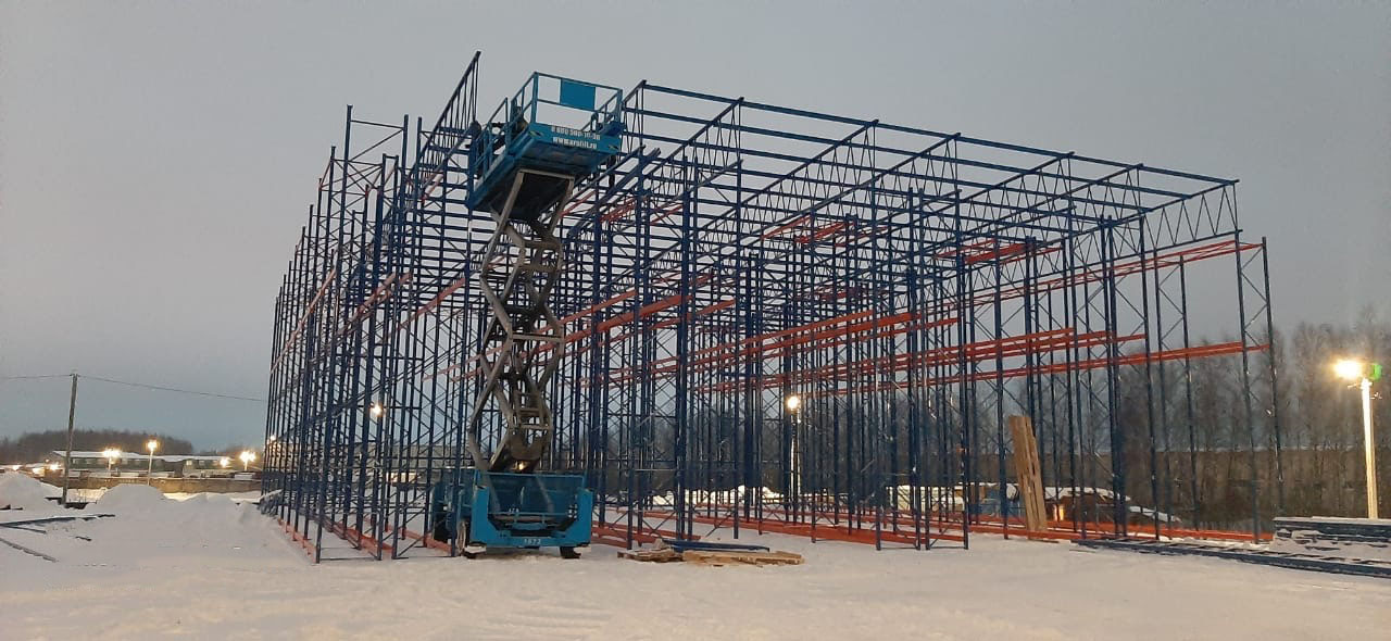 Строительство выполнялось в зимний период с переходом на весеннее время. В строительстве самонесущего склада использовалась дизельная техника, такая как погрузчик, пиканиска (ножничный подъёмник), автокран. Работы по монтажу самонесущего склада были выполнены в срок, несмотря на погодные препятствия.